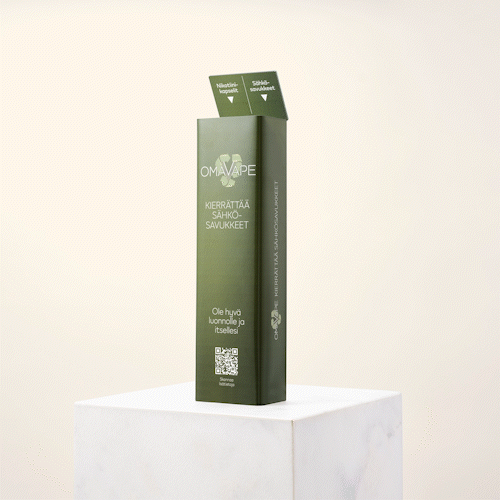 Tyhjennä käytetyt nikotiinikapselit tai kertakäyttöiset sähkösavukkeet vihreään OMAVAPE-kierrätyslaatikkoon tai pyydä apua henkilökunnalta. Löydät laatikot kassalta tai seinältä.
